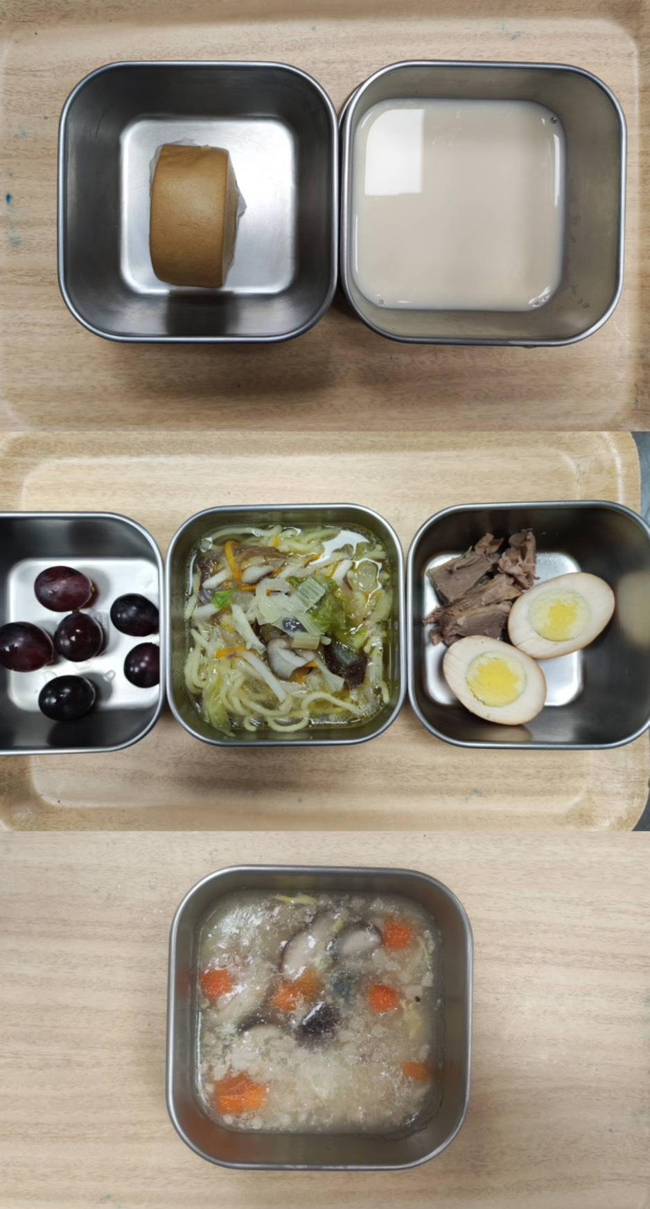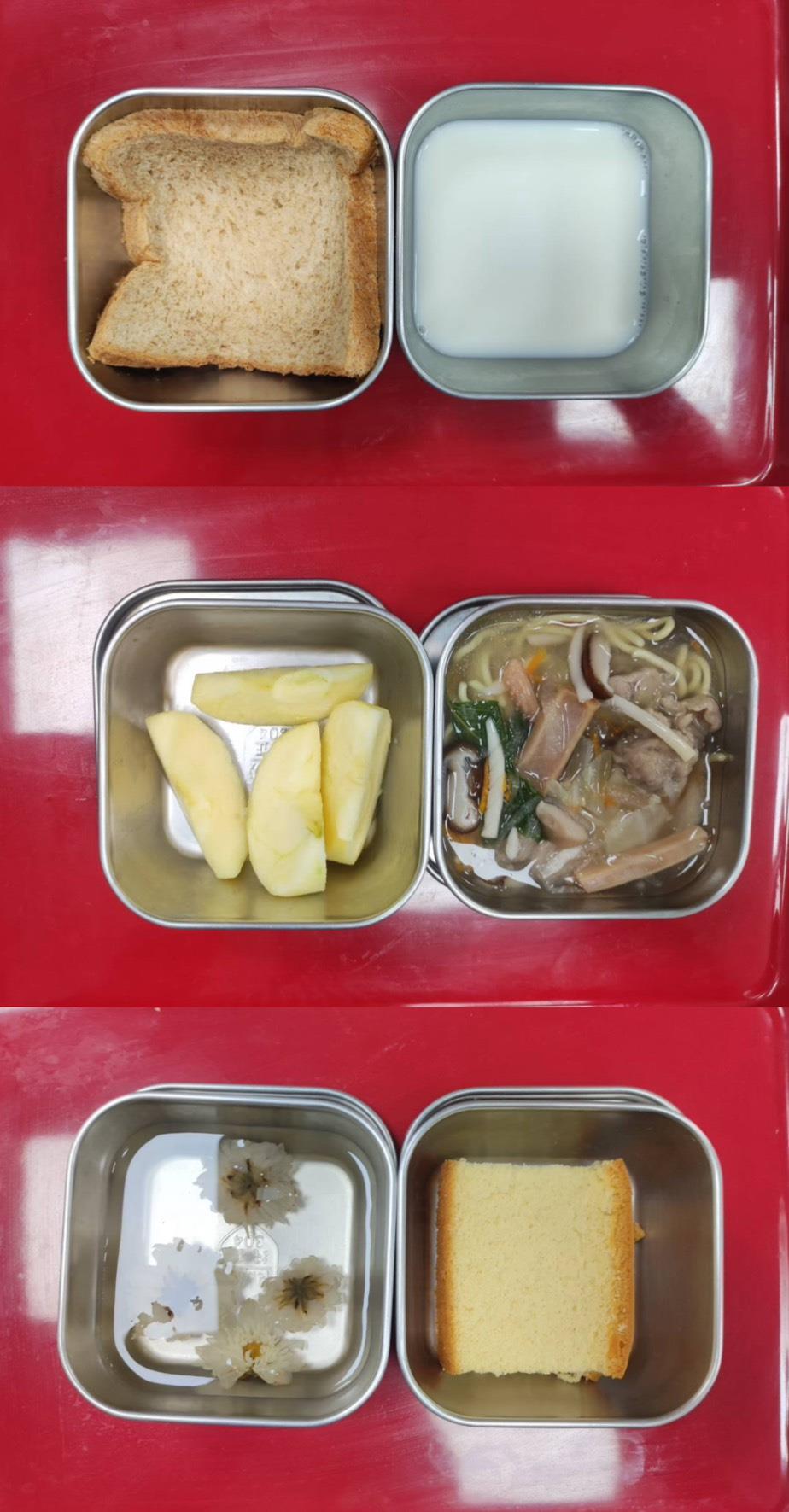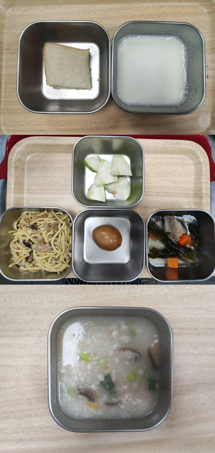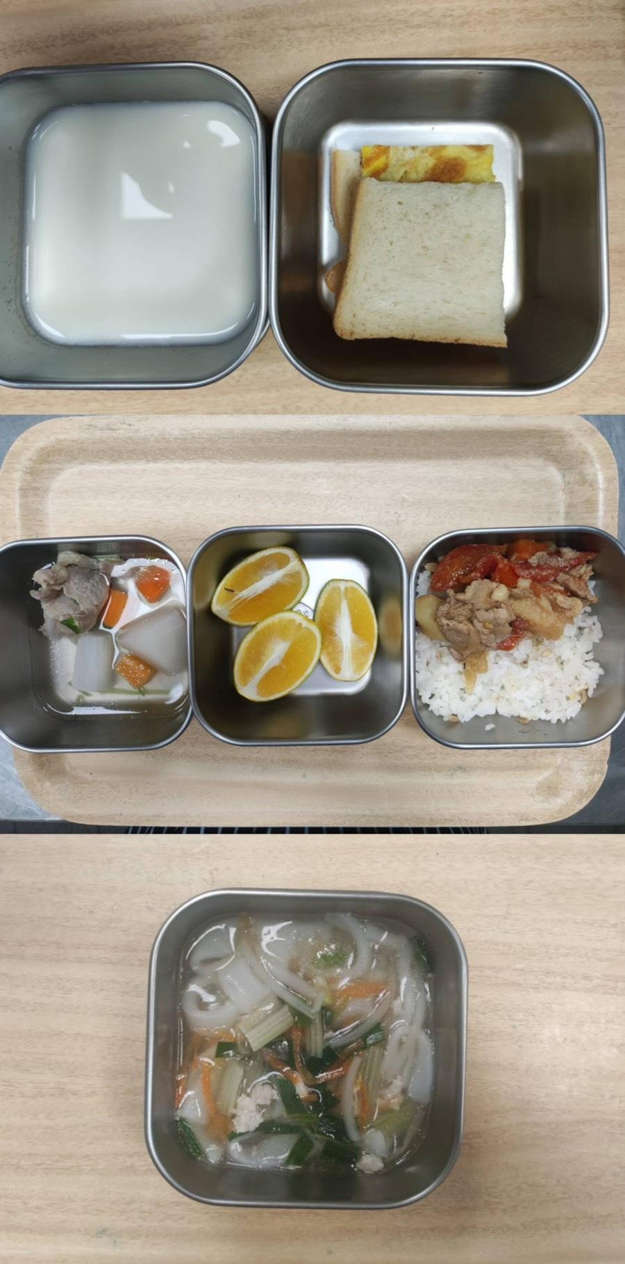 早餐-煎蛋吐司/牛奶 午餐-日式燒肉飯/義式蔬菜湯/水果 *蔬菜湯更改為排骨蘿蔔湯 點心-肉燥粿仔條