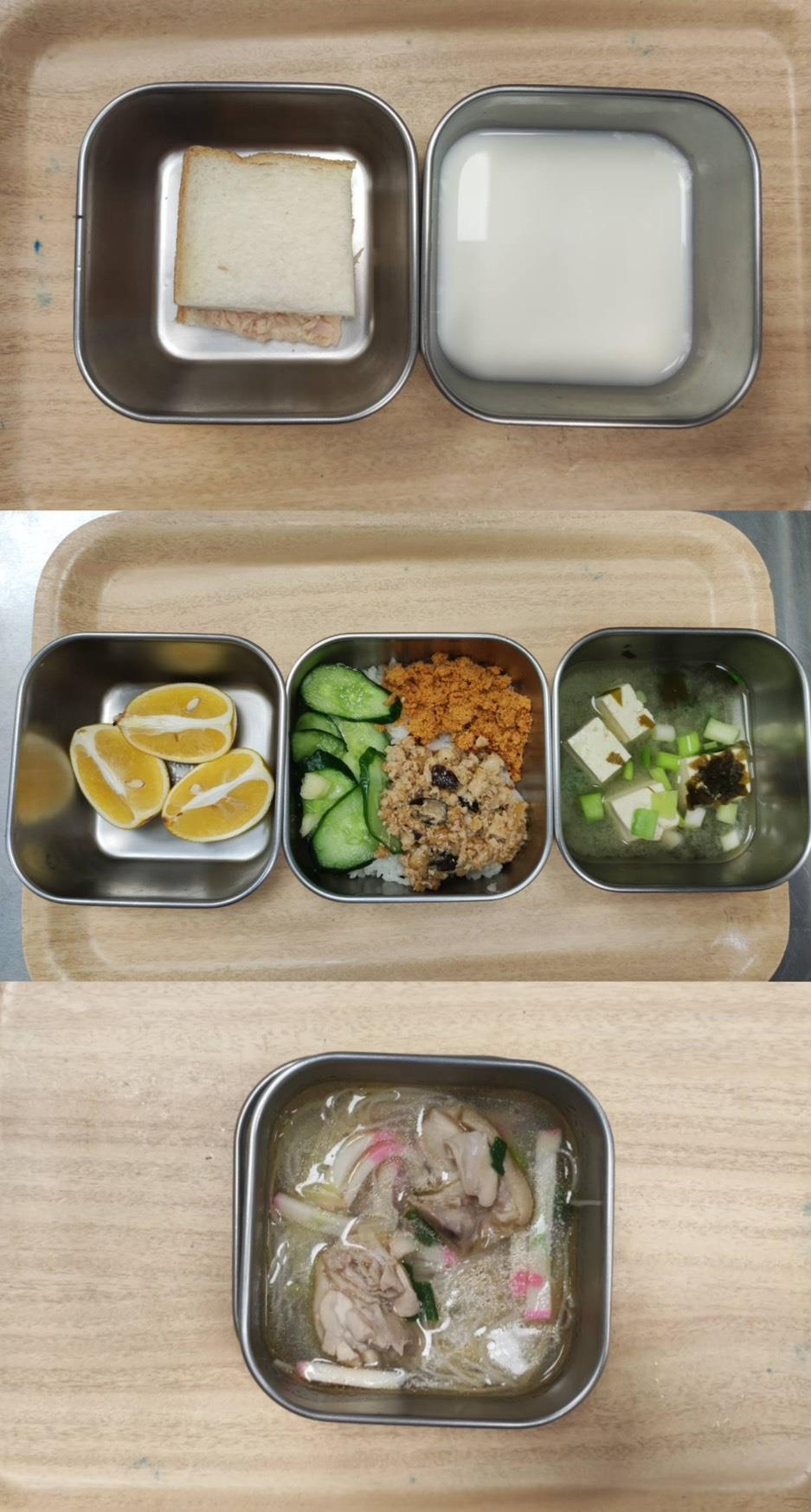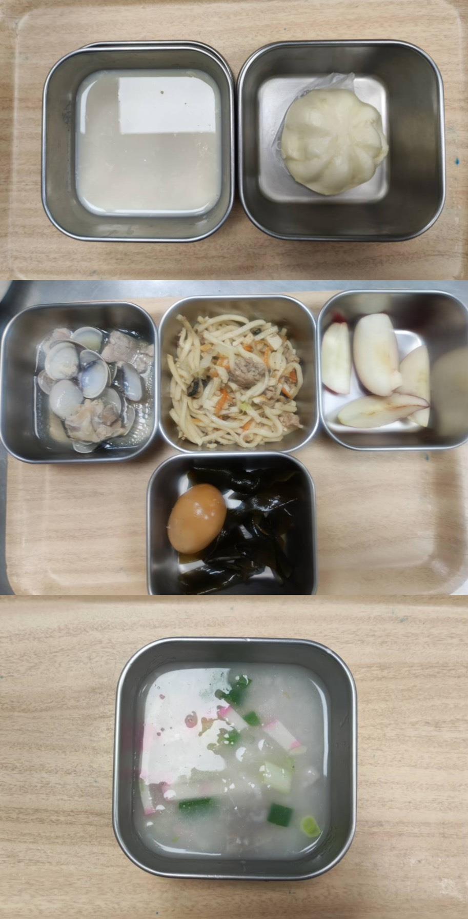 早餐-魚丸冬粉湯 午餐-五穀飯/鹹蛋蒸肉/牛蒡絲甜不辣/季節青菜/味噌豆腐湯/水果 點心-蒜香土司/枸杞茶