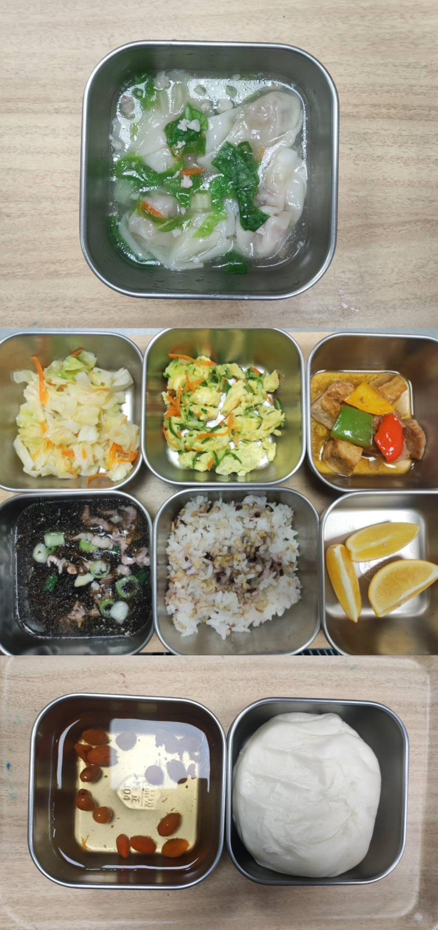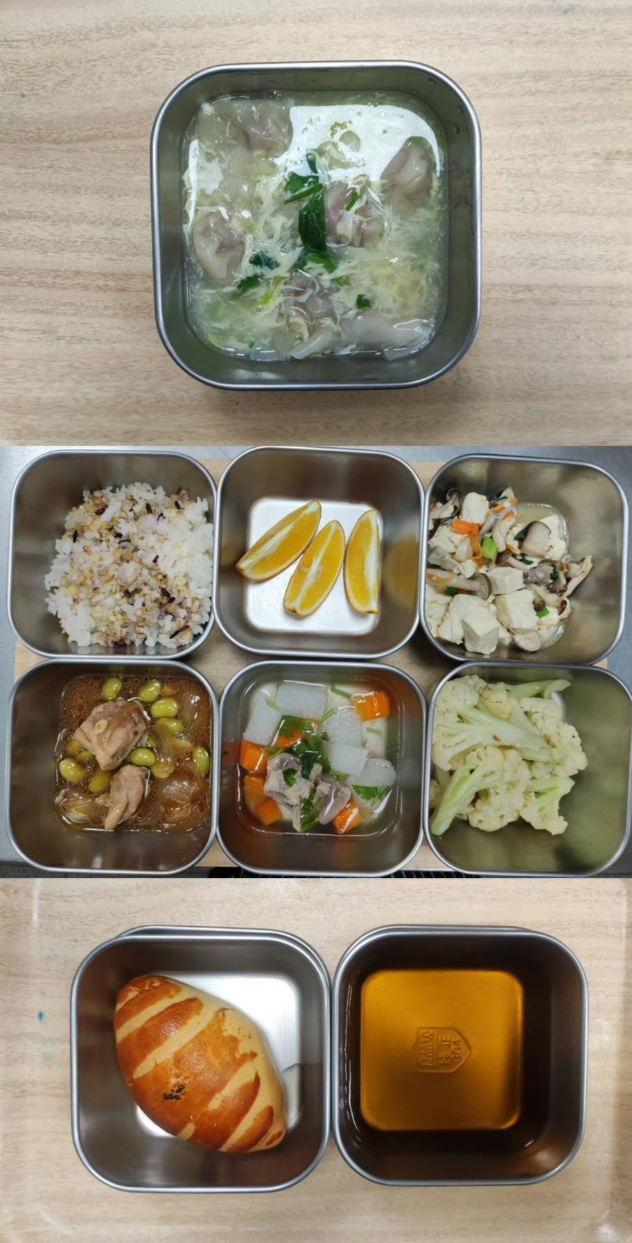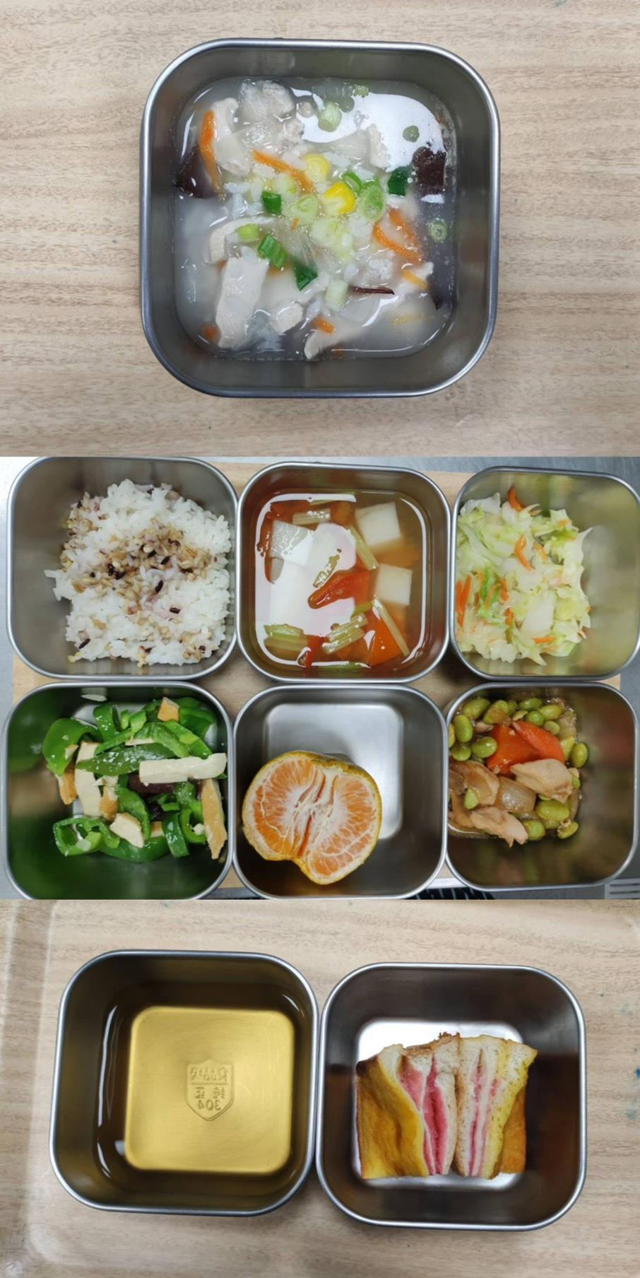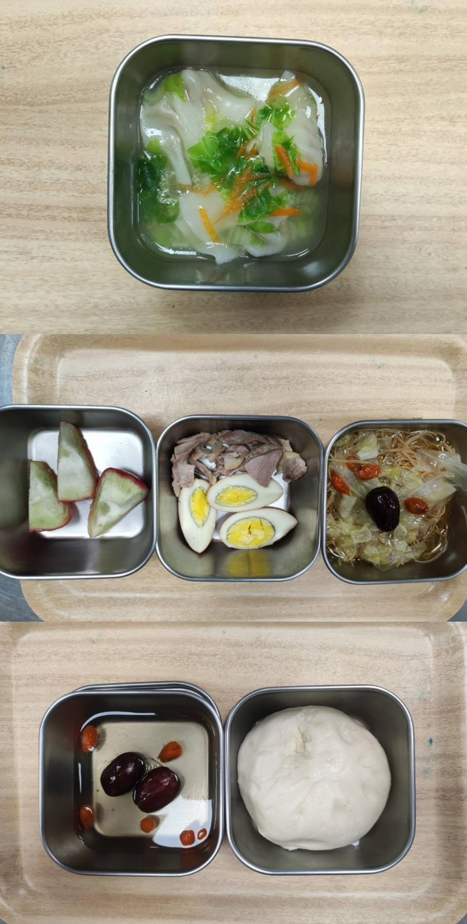 早餐-蛋花雲吞湯 午餐-五穀飯/毛豆炒雞丁/雙菇燒豆腐/季節青菜/蘿蔔排骨湯/水果 點心-羅宋/決明子茶