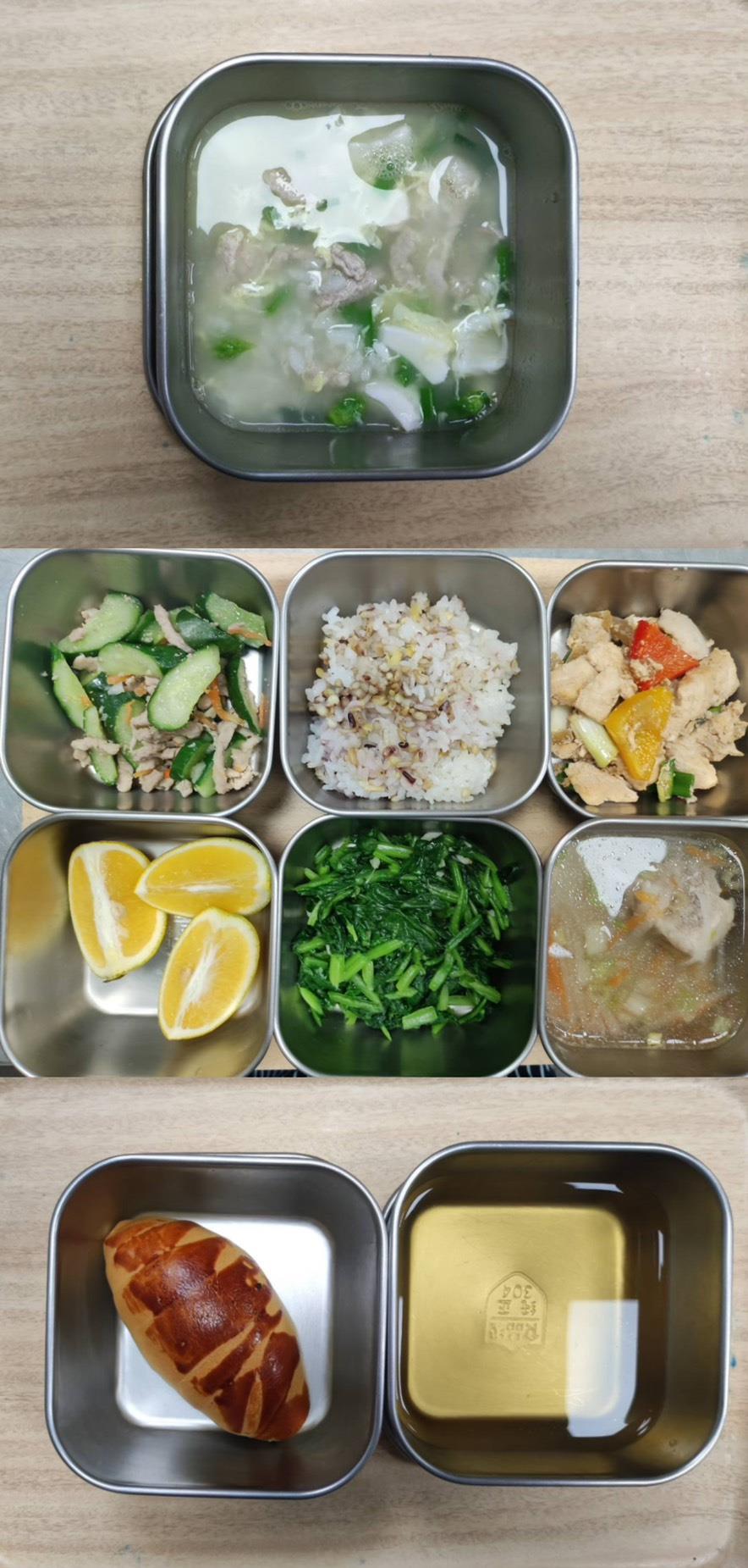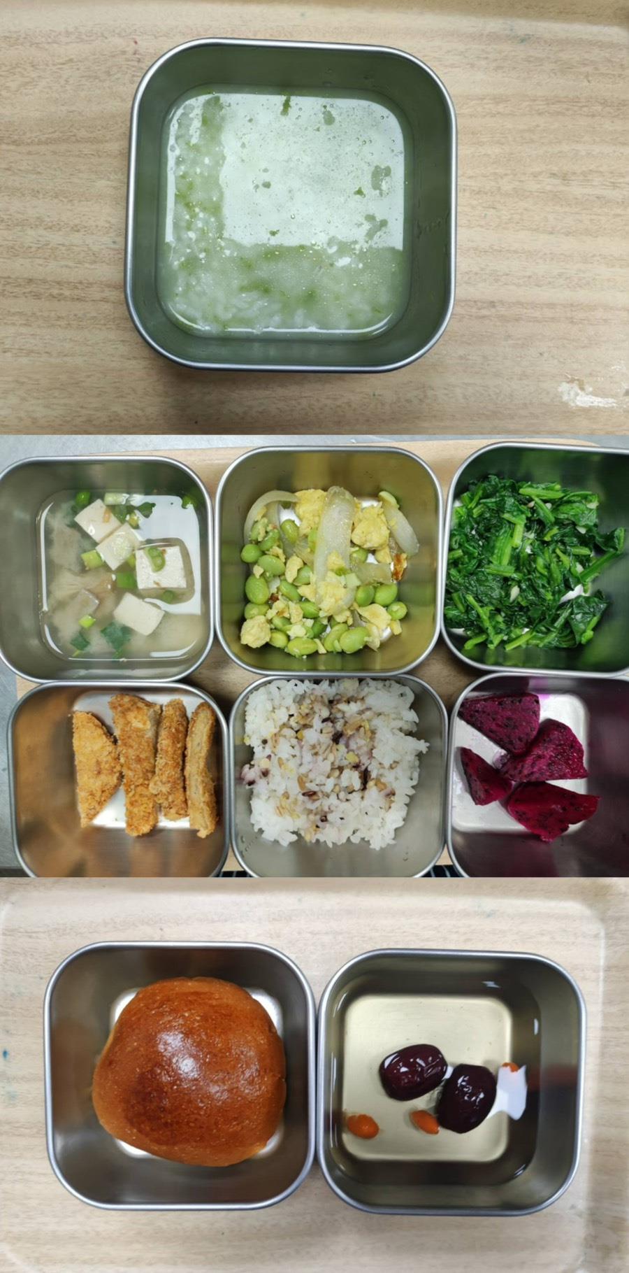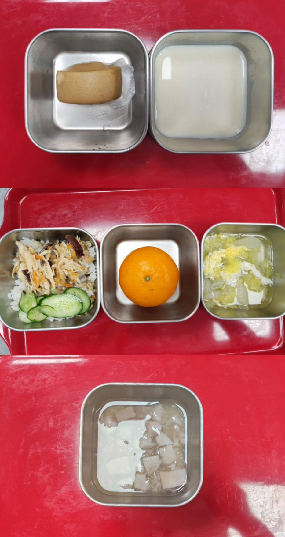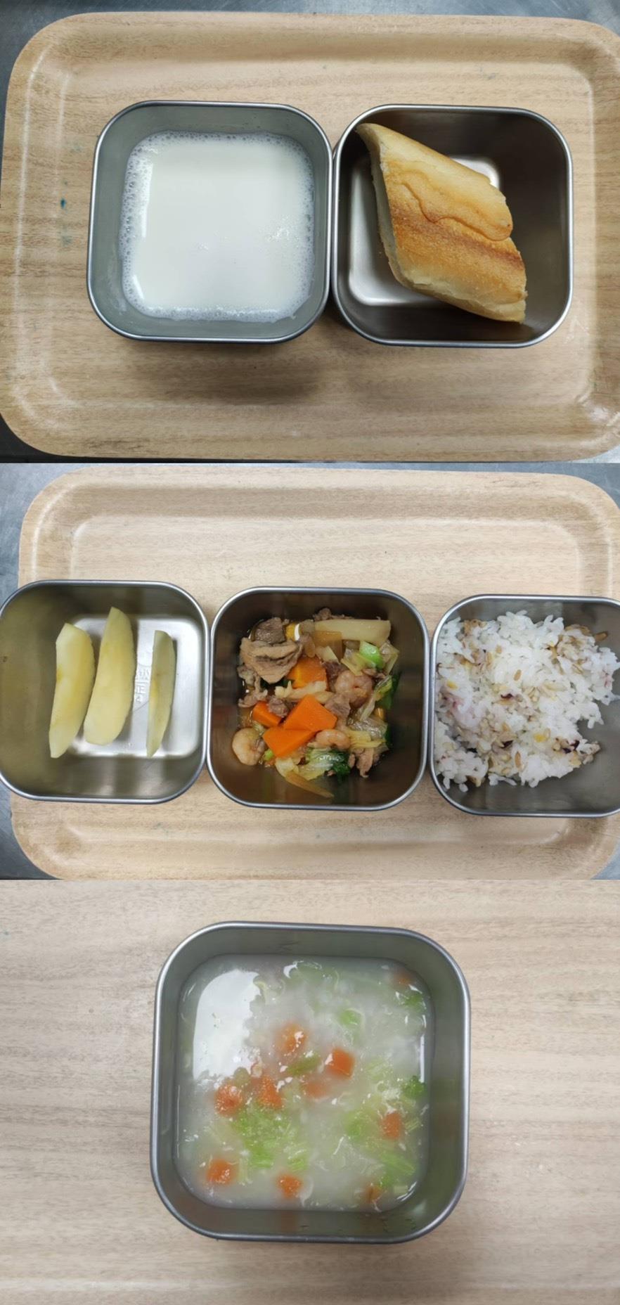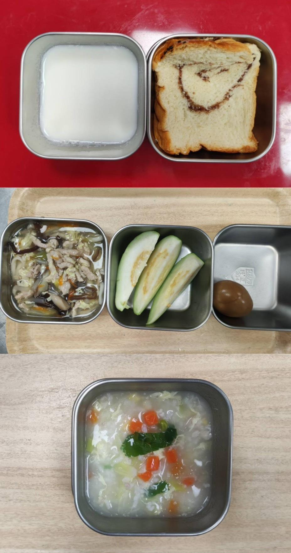 早餐-鹹蛋瘦肉粥 午餐-五穀飯/紅燒魚柳/小黃瓜炒肉絲/季節青菜/豆薯排骨湯/水果 點心-海鹽麵包/麥茶