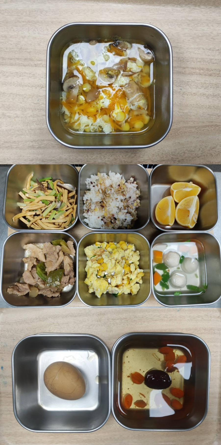 早餐-玉米濃湯 午餐-五穀飯/鹹蛋蒸肉/竹筍炒肉絲/季節青菜/香菇雞湯/水果 點心-蔥麵包/決明子茶