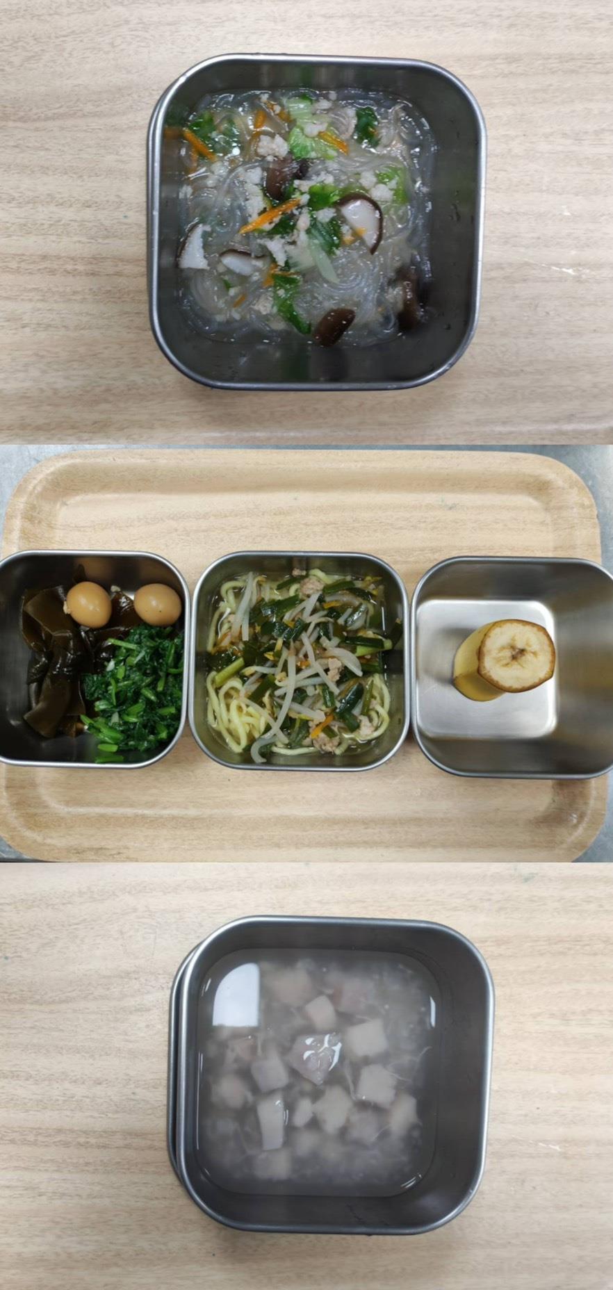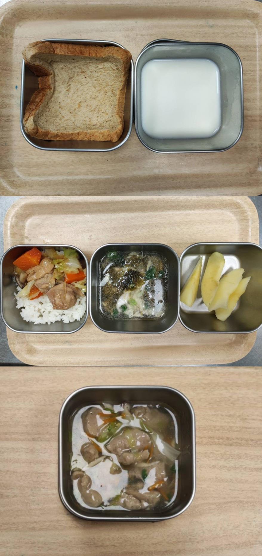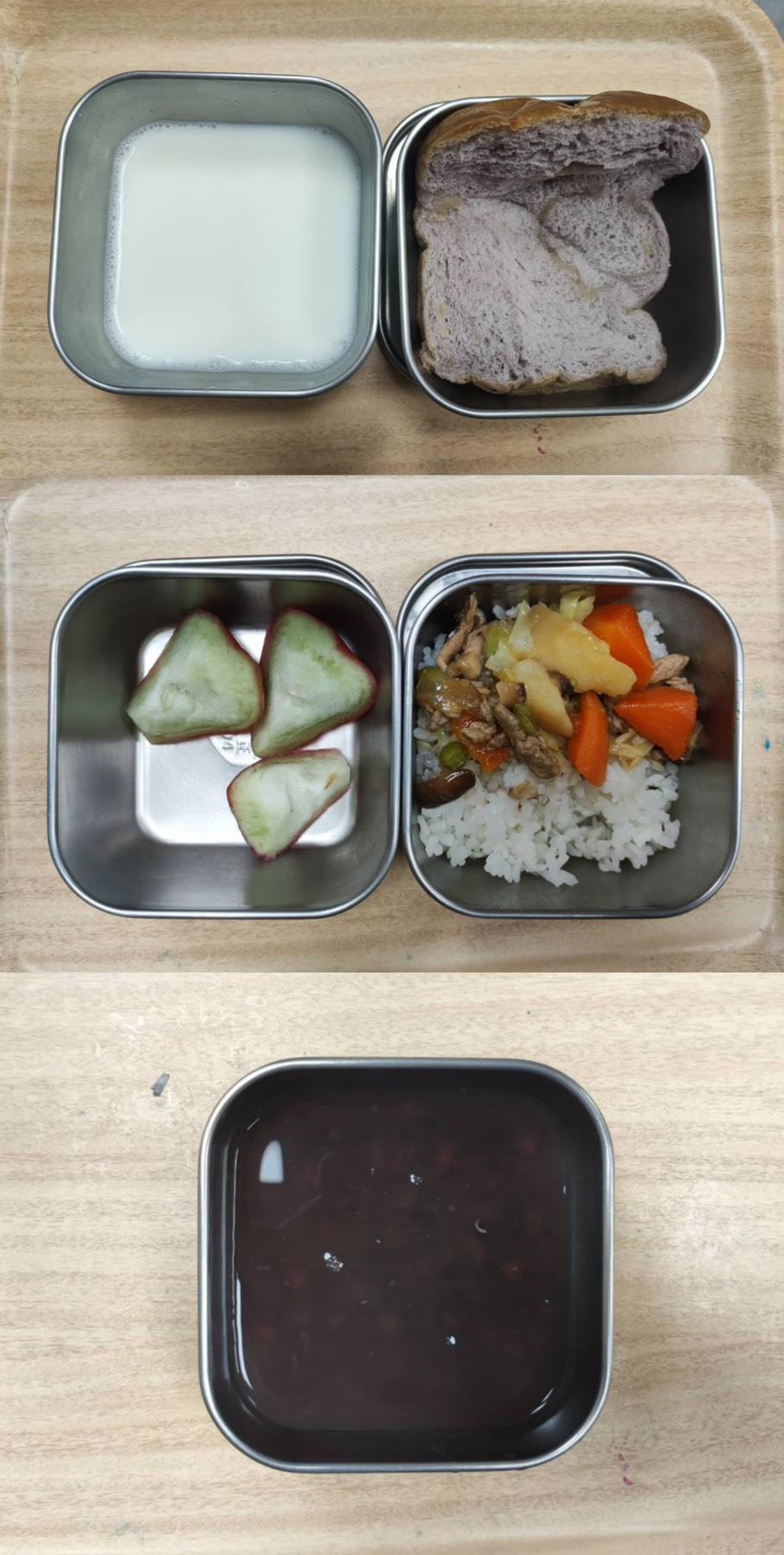 早餐-奶香南瓜燕麥粥 午餐-雞肉燴飯/水果 點心-貢丸肉燥冬粉 註:由於咖哩目前有食用的疑慮,故未使用