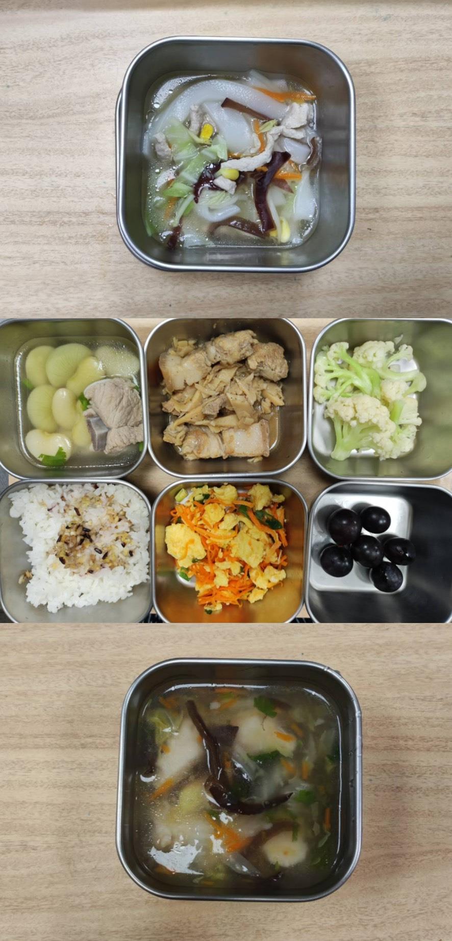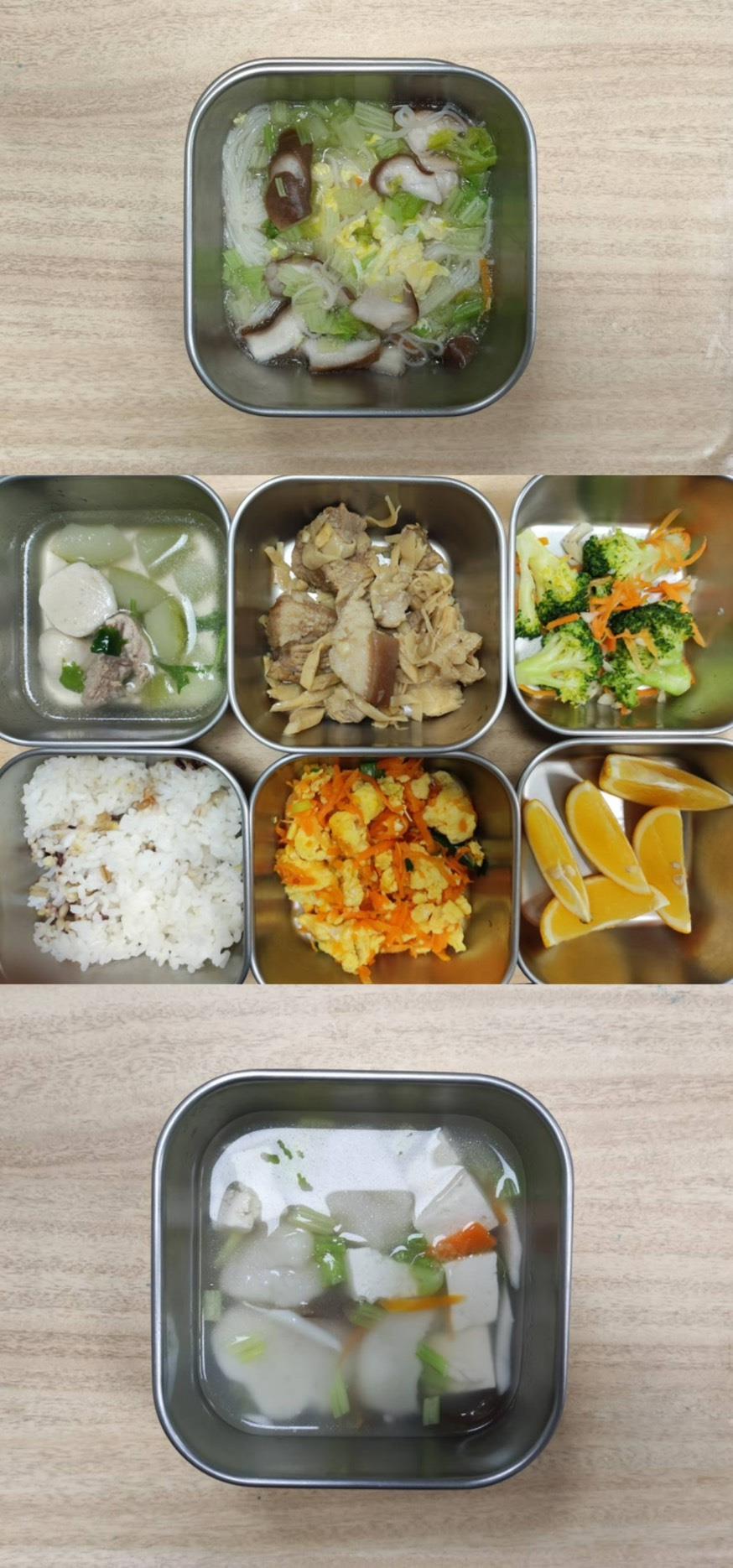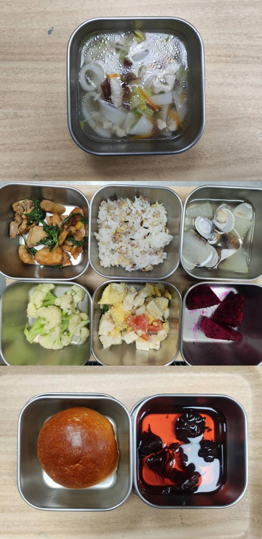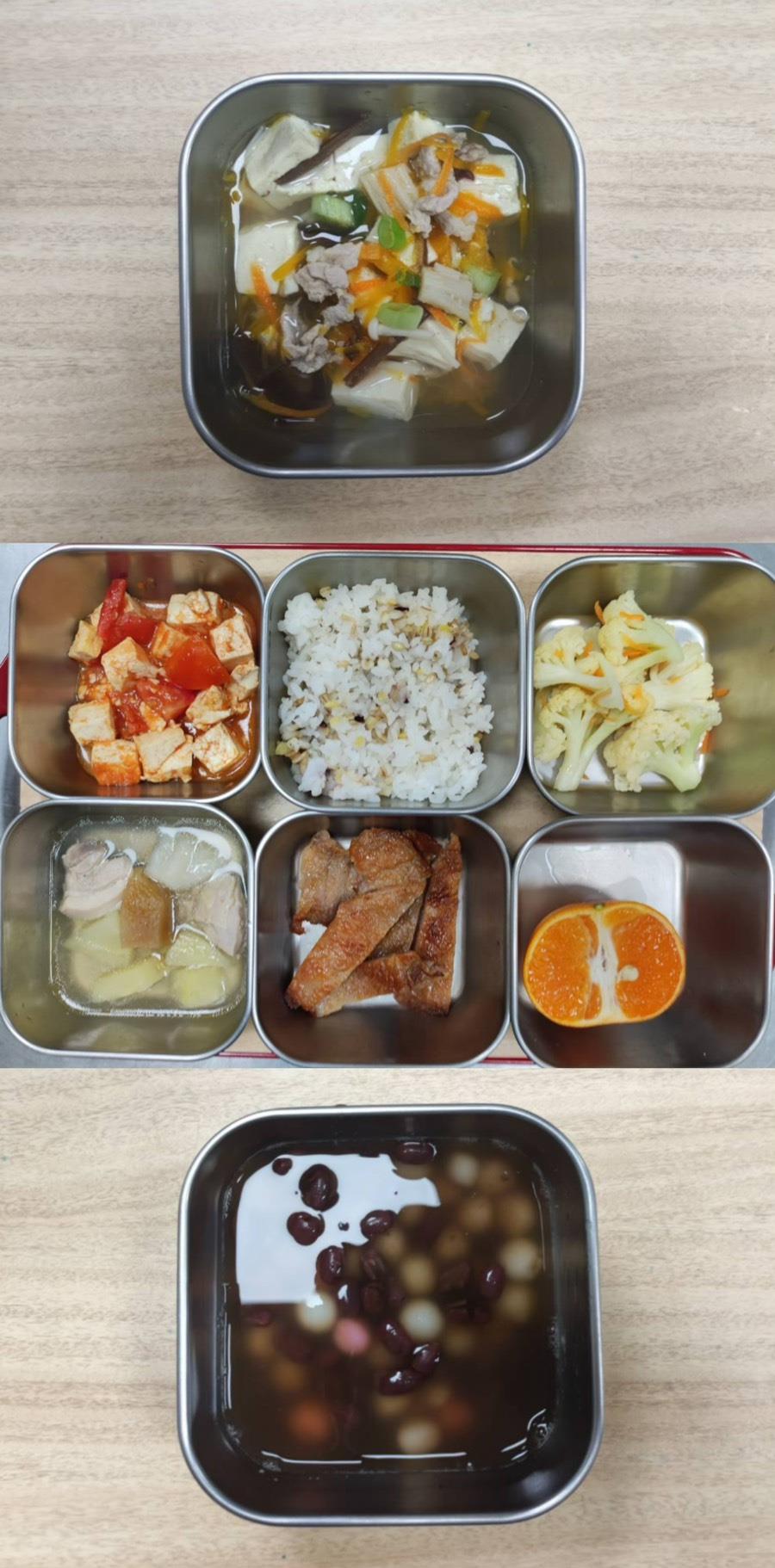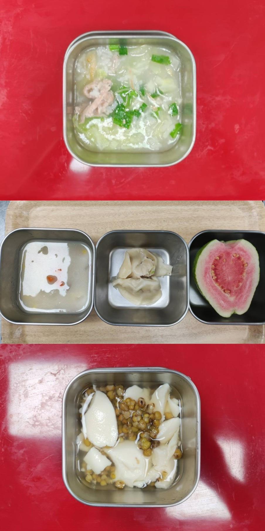 早餐-廣東粥 午餐-五穀米/蒜泥白肉/紅燒豆腐/季節青菜/蘿蔔排骨湯/水果 點心-綠豆蒜西米露
