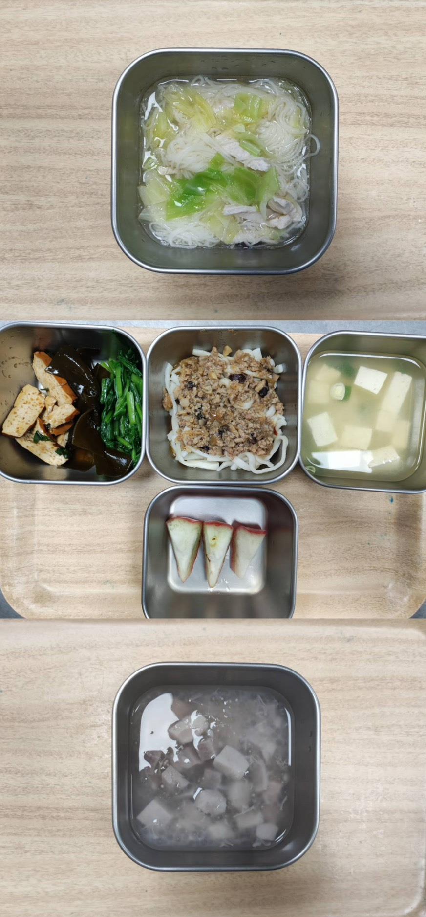 早餐-芋頭米粉湯 午餐-五穀飯/醬燒肉丸/炒牛蒡甜不辣/季節青菜/鮮魚味增豆腐湯/水果 點心-山藥枸杞雞肉粥