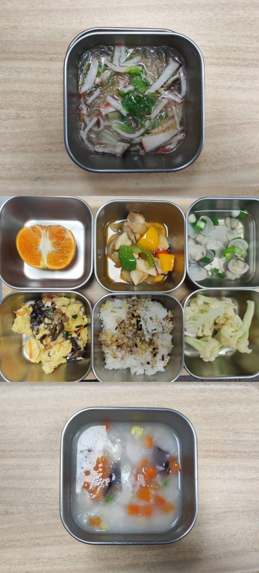 早餐-皮蛋瘦肉粥 午餐-五穀飯/杏鮑菇蘿蔔燉肉/芹菜甜不辣/季節青菜/薑絲冬瓜蛤蜊湯/水果 點心-什錦蘿蔔糕湯