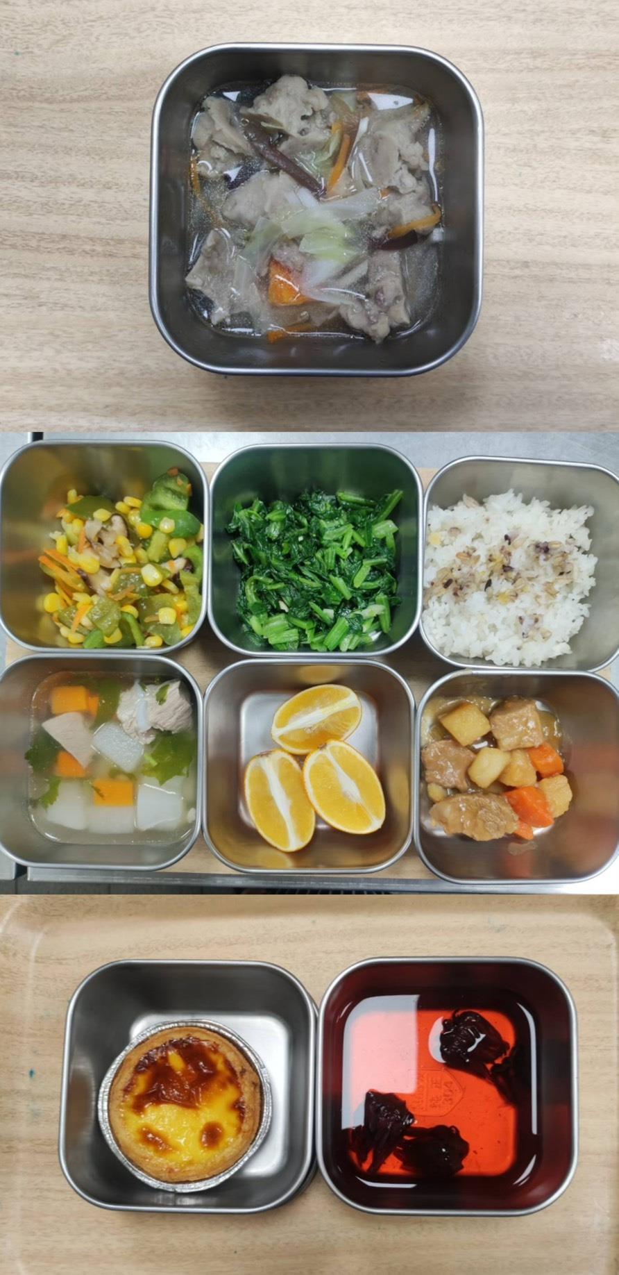 早餐-筍絲肉羹 午餐-五穀飯/馬鈴薯燒肉/香菇炒玉米青椒/季節青菜/蘿蔔排骨湯/水果 點心-蛋塔/洛神花茶