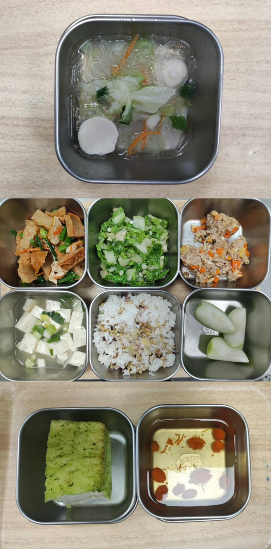 早餐-蔬菜麵疙瘩 午餐-五穀飯/雞絲炒豆包絲/悶南瓜/什錦豆腐/虱目魚柳湯/水果 點心-海鹽麵包/麥茶