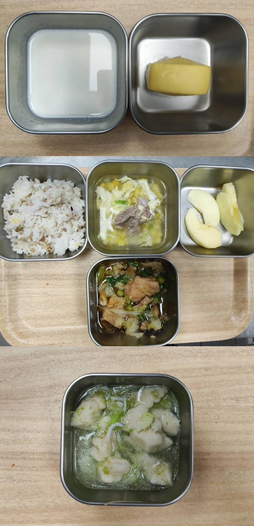 早餐-玉米雞茸羹 午餐-五穀飯/紅燒雞丁/木耳炒蛋/季節青菜/味增豆腐湯/水果 點心-水煮玉米/紅棗茶