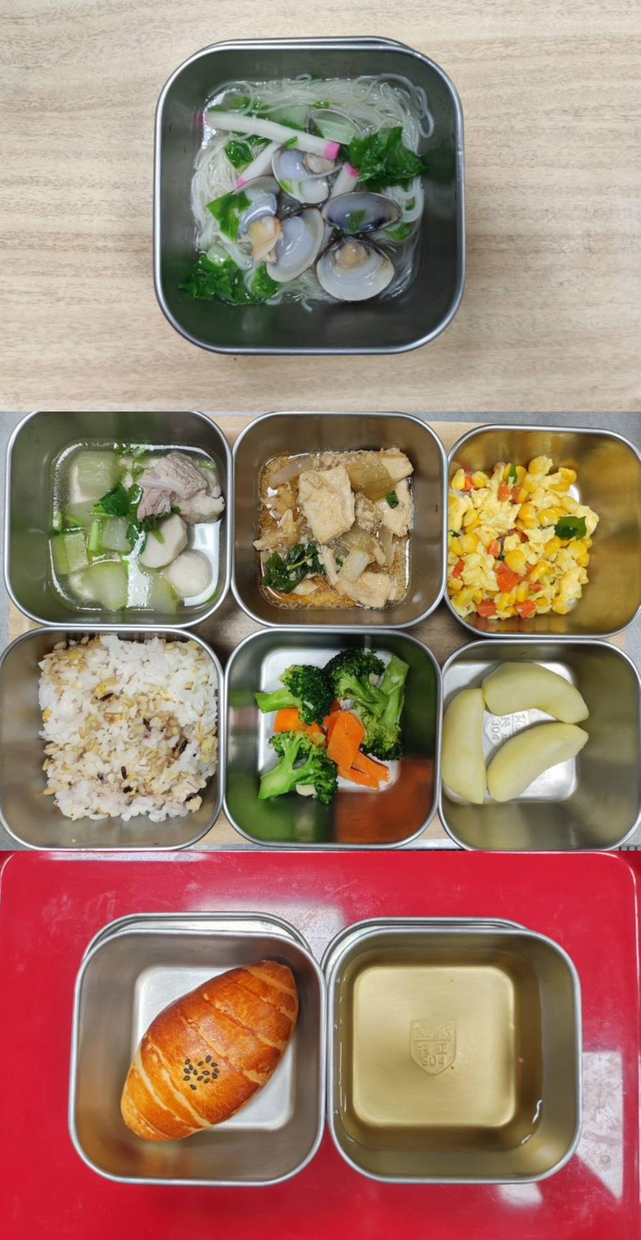 早餐-蟹絲冬粉 午餐-五穀飯/紅燒獅子頭/玉米蛋/季節青菜/豆腐味增湯/水果 點心-波蘿麵包/決明子茶