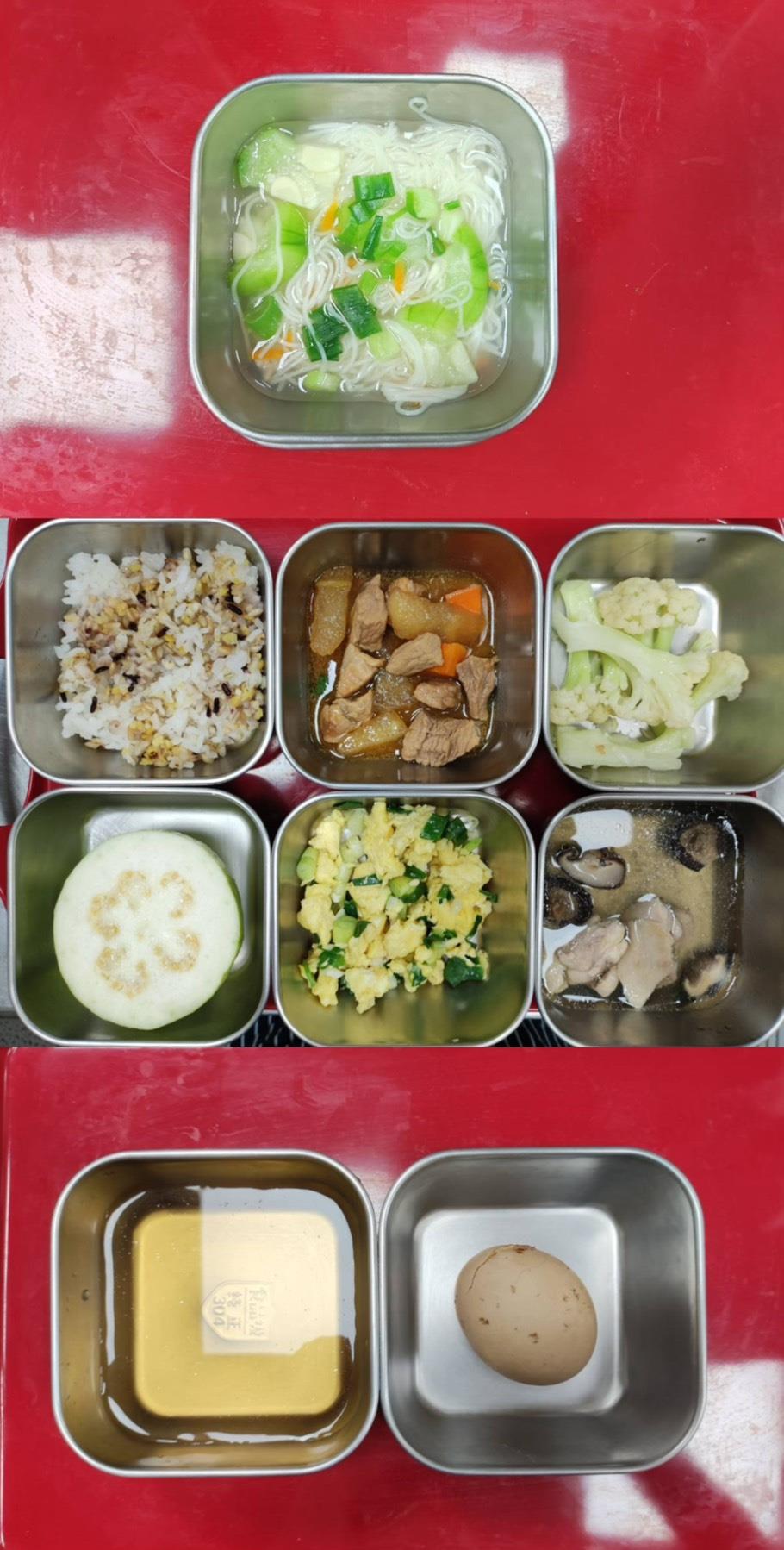 早餐-絲瓜肉絲麵線 午餐-五穀飯/冬瓜封肉/青蔥炒蛋/季節青菜/香菇雞湯/水果 點心-茶葉蛋/ 冬瓜茶