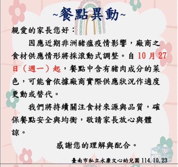 10月27日起,餐點中含有豬肉成分的菜色,會依據廠商實際供應狀況作適度更動或替代。