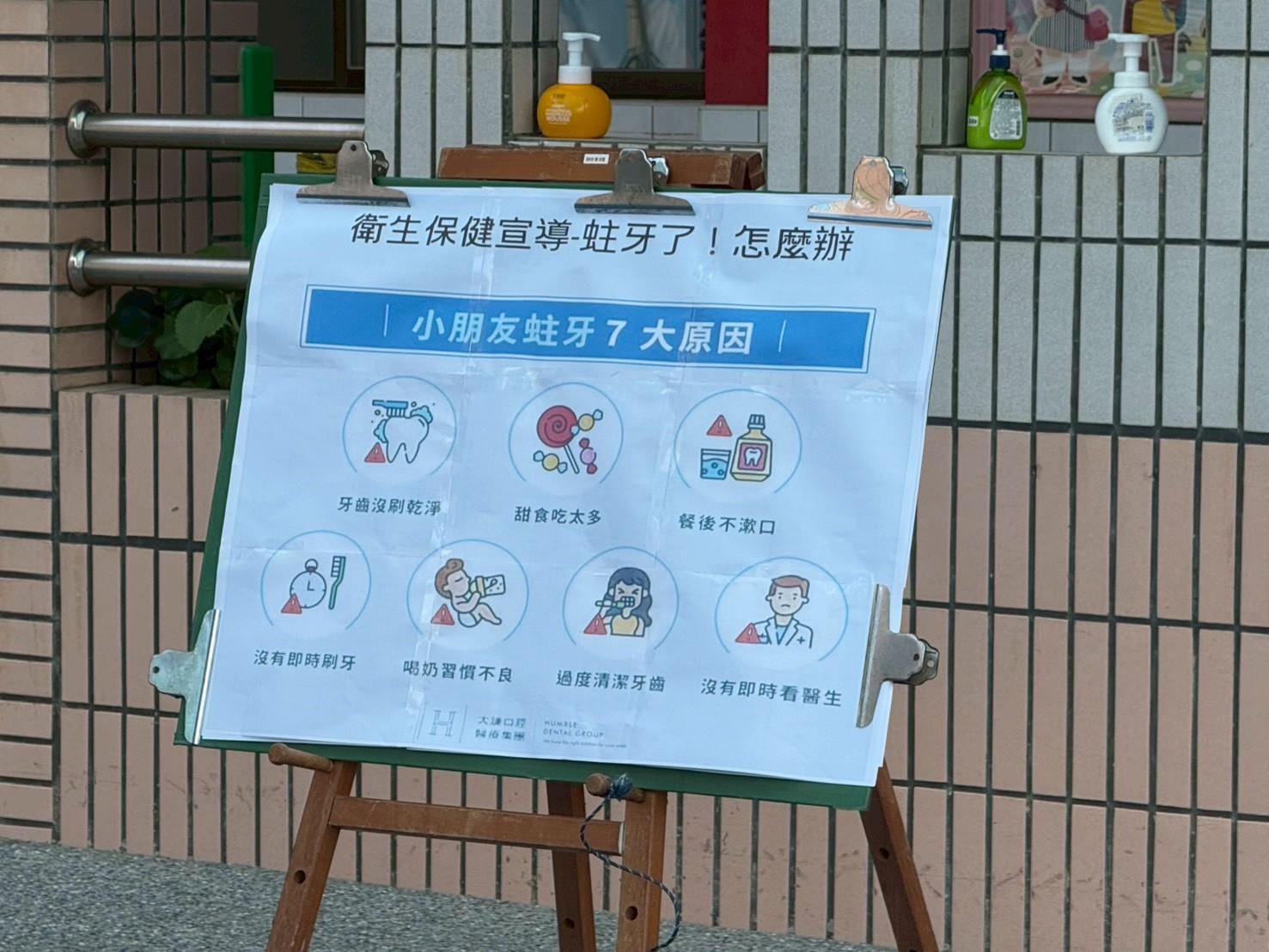 衛生保健宣導-蛀牙了!怎麼辦 活動消息 介紹蛀牙是因為牙齒上殘留食物,被細菌吃掉後變成酸,讓牙齒越來越破洞。接著引導幼兒認識哪些食物會容易造成蛀牙(如糖果、餅乾、含糖飲料)。 2025-11-19 顏翊宸 Read more