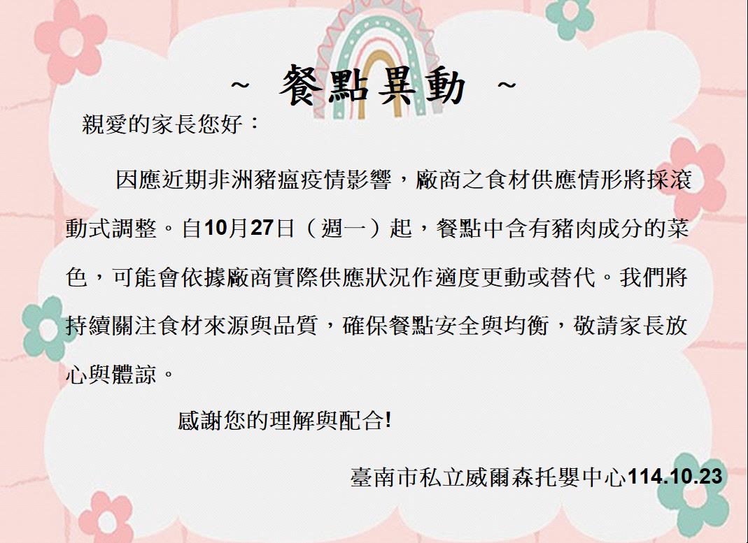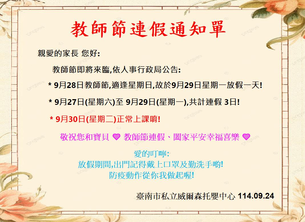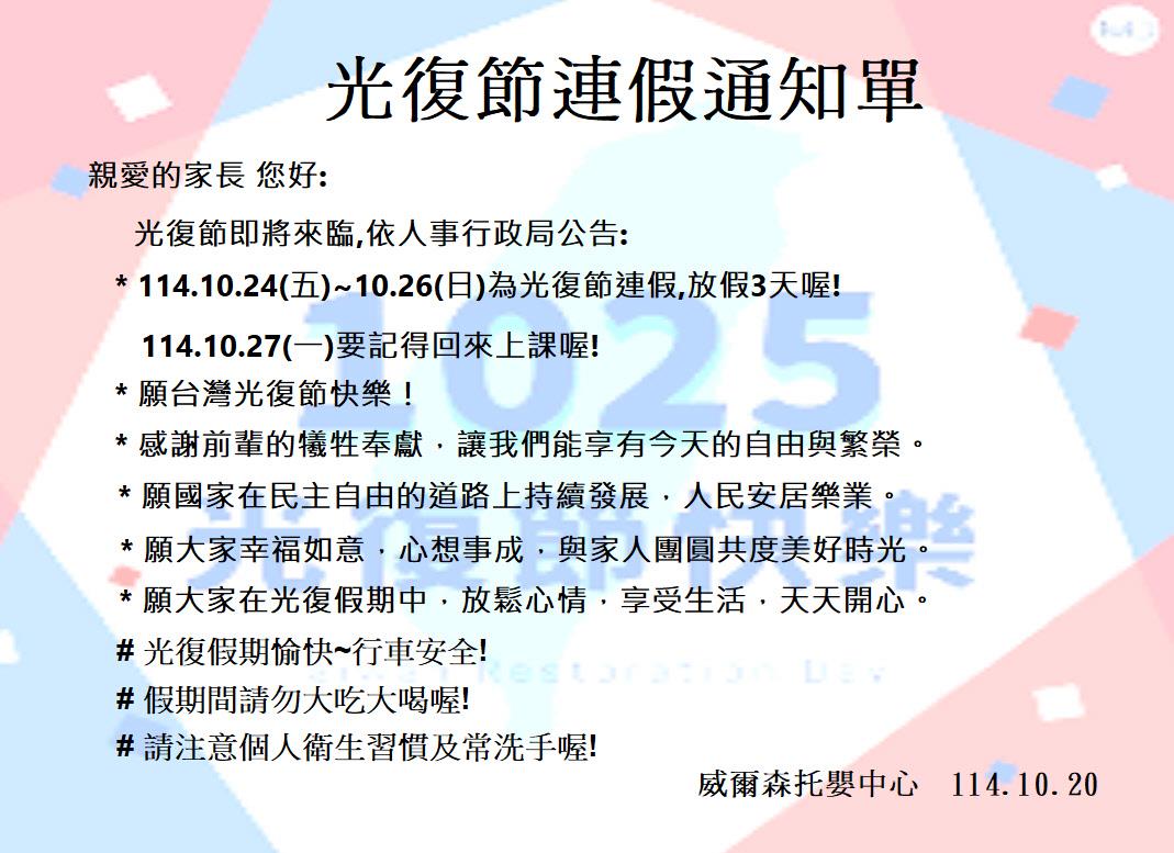 光復連假通知單 活動消息 📢放假通知... 依行政院人事局公告: 114.10.24(五)~10.26(日)為光復連假,放假3天喔! 10/27(一)寶貝們要記得回來上課哦😉 2025-10-23 古佩蓉 Read more