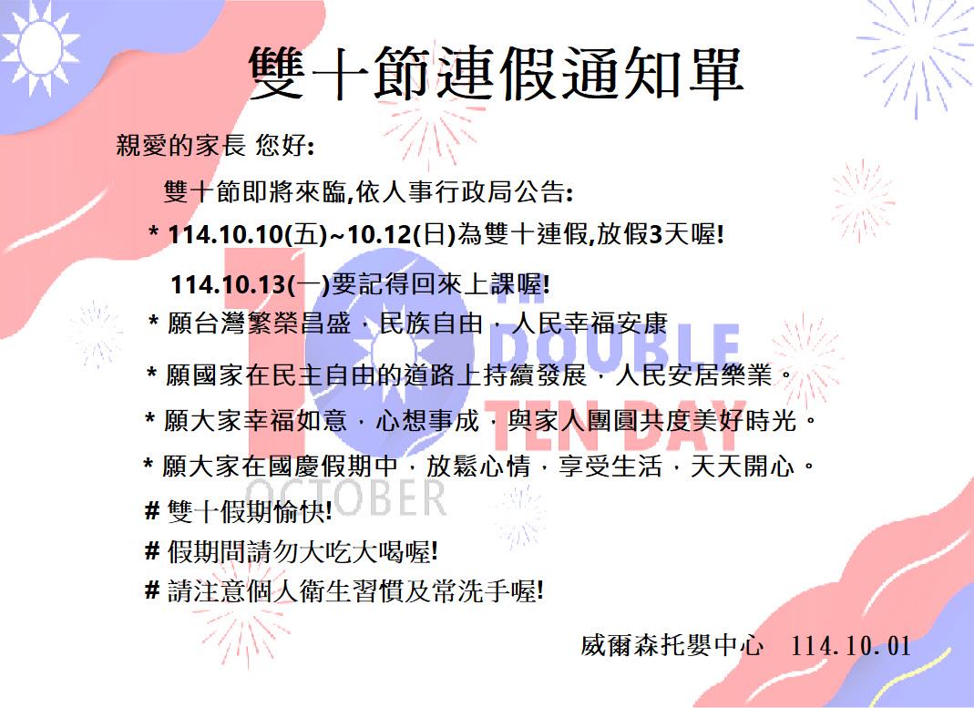 雙十節連假通知單 活動消息 📢放假通知... 依行政院人事局公告: 114.10.10(五)~10.12(日)為雙十連假,放假3天喔!10/13(一)要記得回來上課哦😉 2025-10-09 古佩蓉 Read more