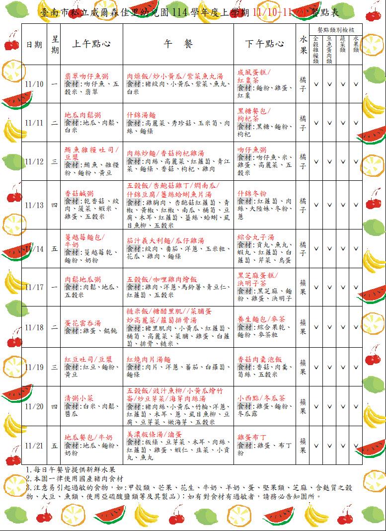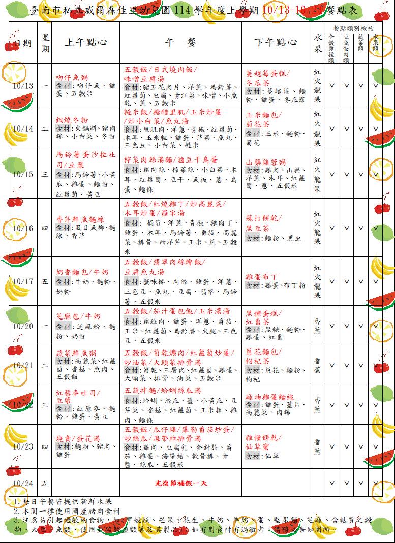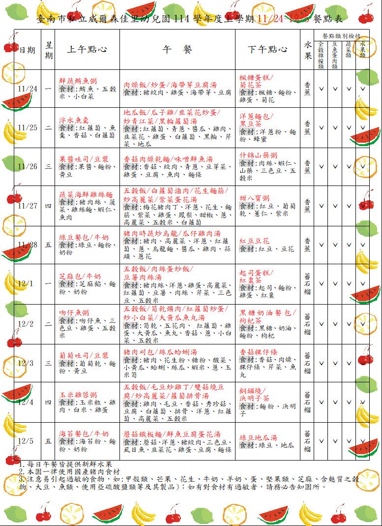 114學年上學期1124-1205餐點表 食在健康 親愛的家長你(妳)好:園所公告的餐點表為暫定預告版,如想知道當日園所菜單,可上食材登錄平台,搜尋{臺南市佳里區臺南私立威爾森佳里幼兒園},謝謝!! 2025-11-21 李怡蒨 Read more