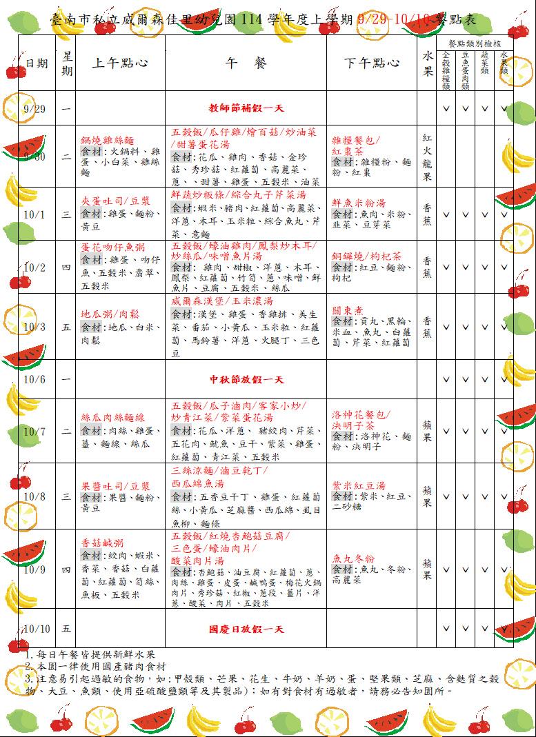114學年上學期0929-1010餐點表 食在健康 親愛的家長你(妳)好:園所公告的餐點表為暫定預告版,如想知道當日園所菜單,可上食材登錄平台,搜尋{臺南市佳里區臺南私立威爾森佳里幼兒園},謝謝!! 2025-10-01 李怡蒨 Read more
