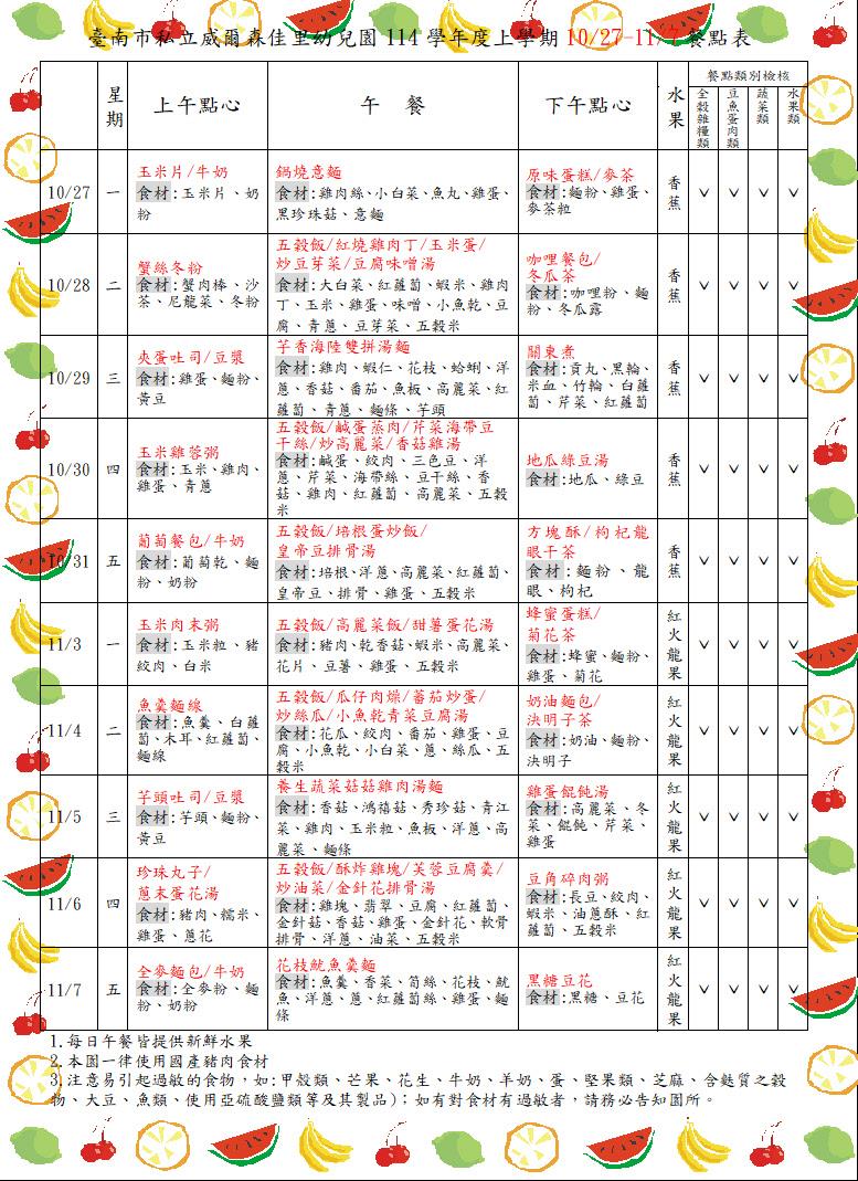 114學年上學期1027-1107餐點表 食在健康 親愛的家長你(妳)好:園所公告的餐點表為暫定預告版,如想知道當日園所菜單,可上食材登錄平台,搜尋{臺南市佳里區臺南私立威爾森佳里幼兒園},謝謝!! 2025-10-23 李怡蒨 Read more