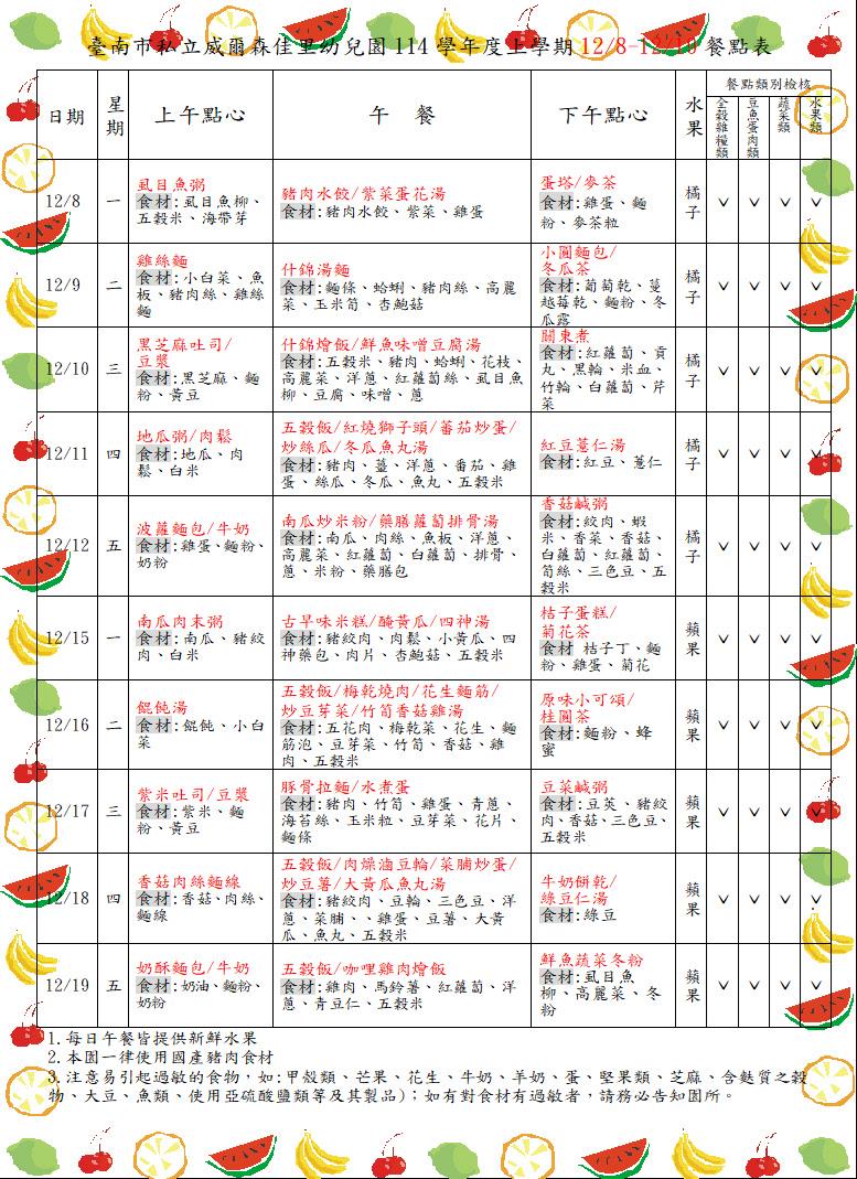 114學年上學期1208-1219餐點表 食在健康 親愛的家長你(妳)好:園所公告的餐點表為暫定預告版,如想知道當日園所菜單,可上食材登錄平台,搜尋{臺南市佳里區臺南私立威爾森佳里幼兒園},謝謝!! 2025-11-21 李怡蒨 Read more