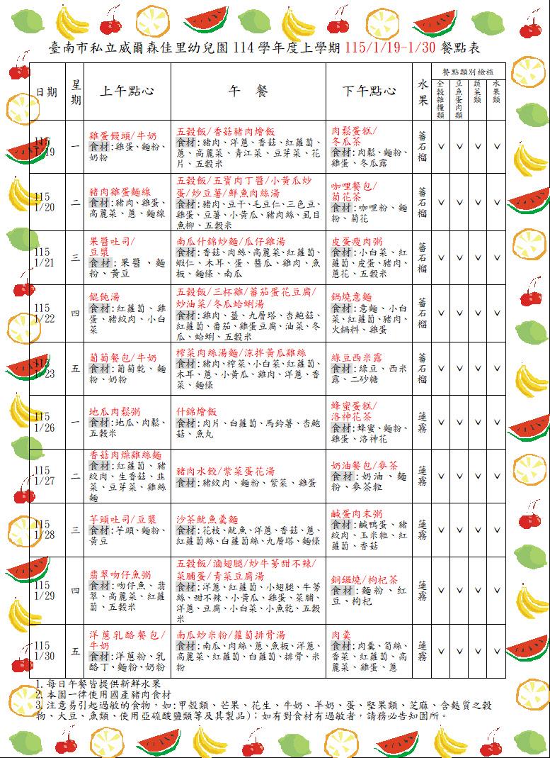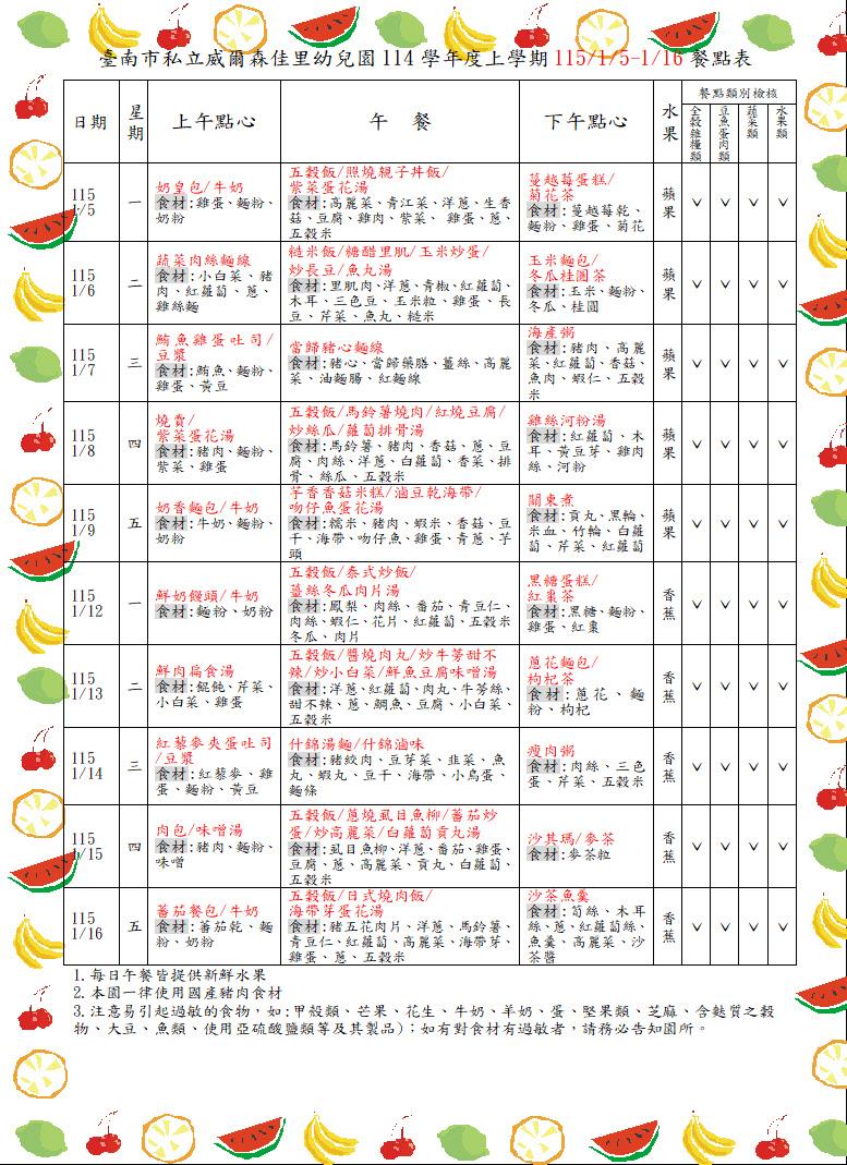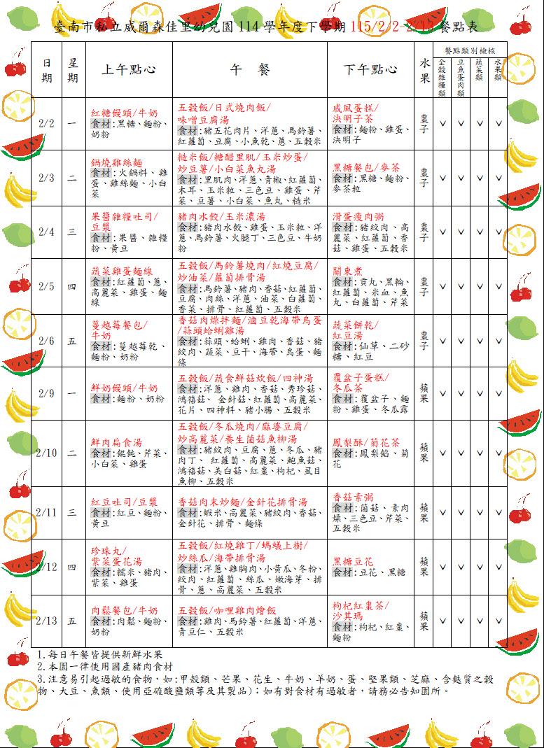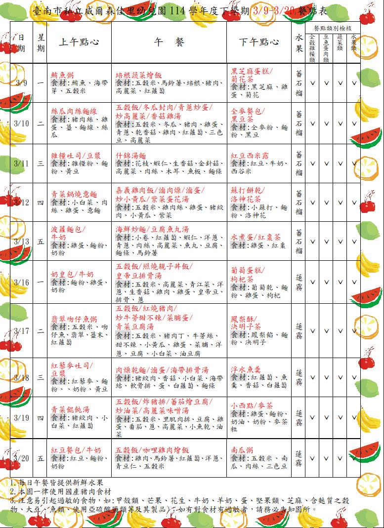 親愛的家長你(妳)好: 目前園所公告的餐點表為暫定預告版,如想知道當日園所菜單,可上食材登錄平台,搜尋【臺南市佳里區臺南市私立威爾森佳里幼兒園】,謝謝!!