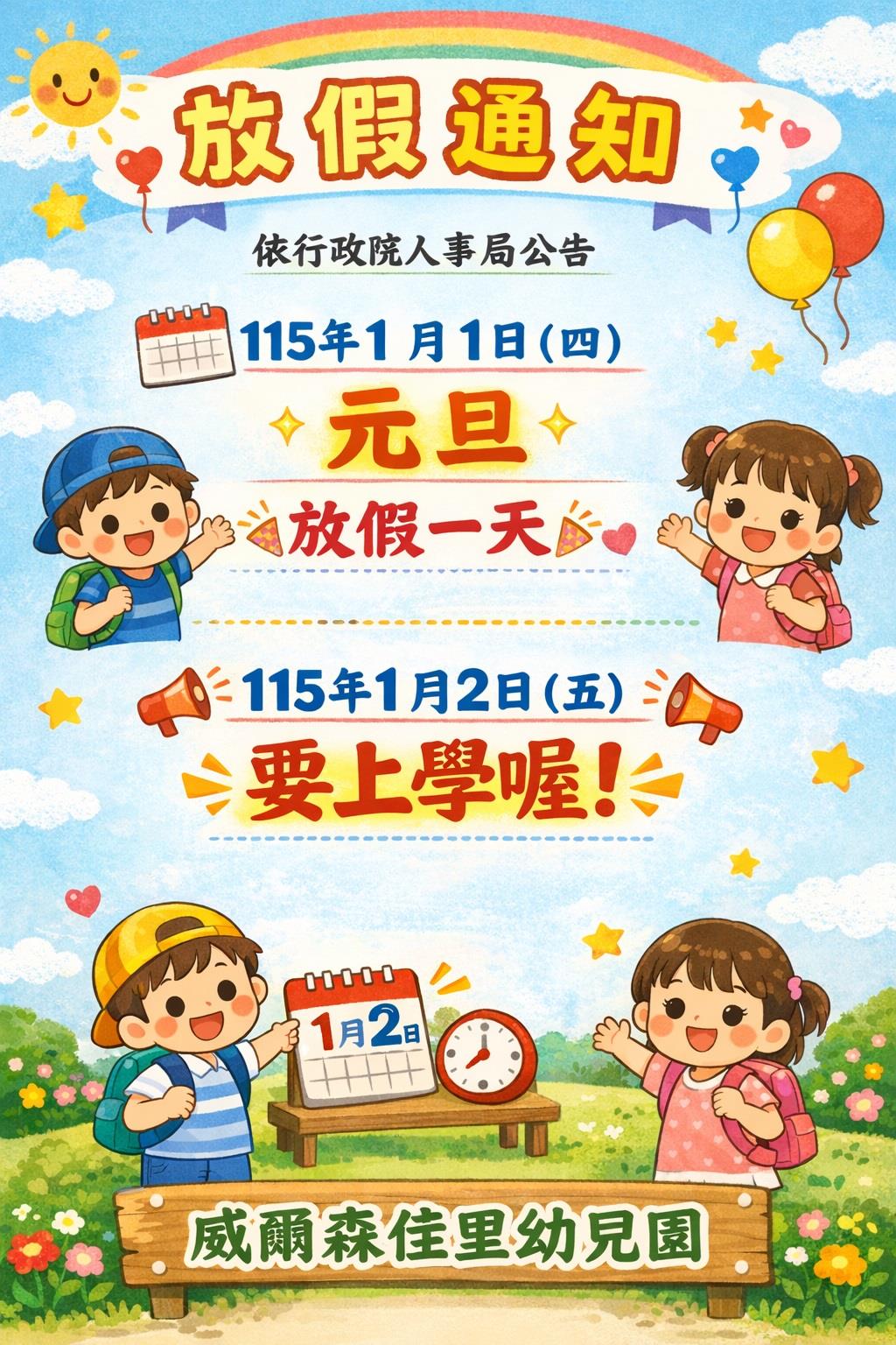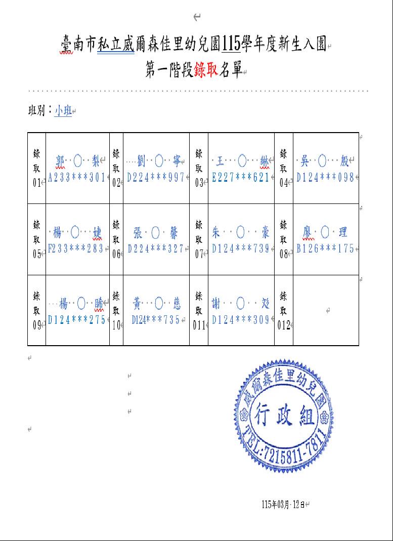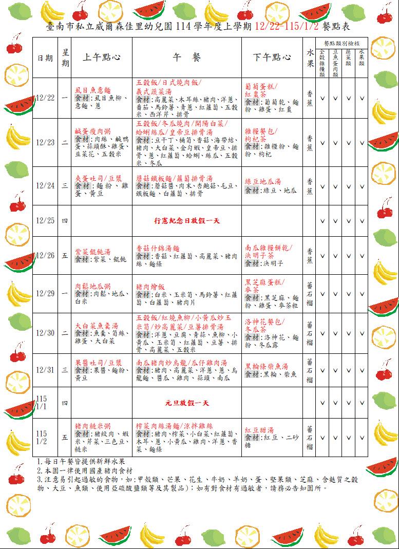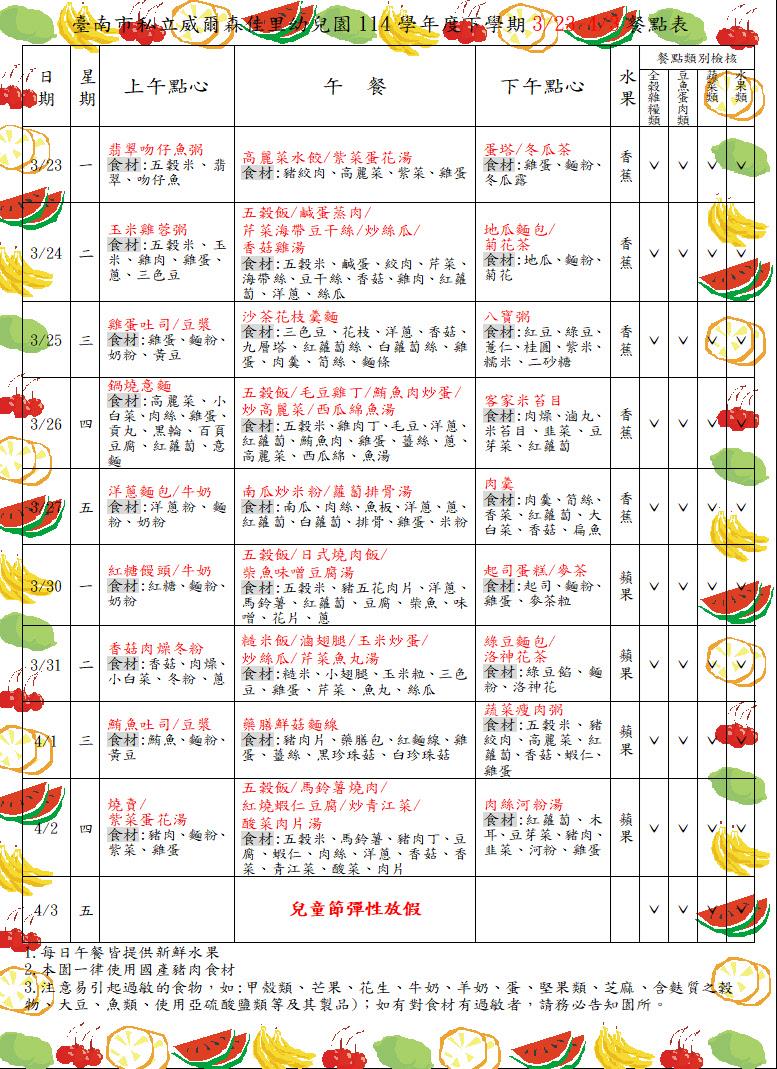 親愛的家長你(妳)好: 目前園所公告的餐點表為暫定預告版,如想知道當日園所菜單,可上食材登錄平台,搜尋【臺南市佳里區臺南市私立威爾森佳里幼兒園】,謝謝!!