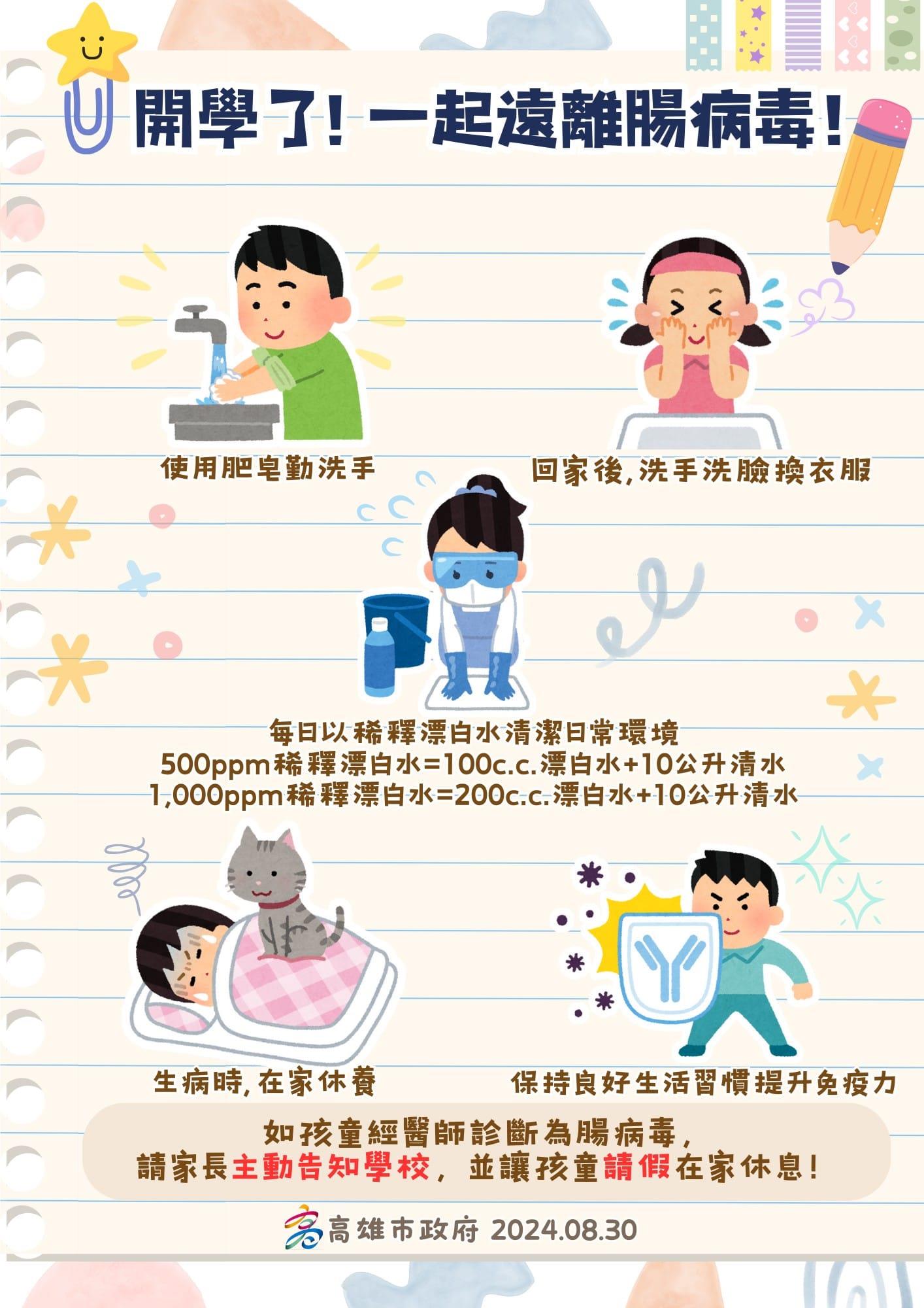 1. 學(幼)童生病不上學、大人小孩皆應正確勤洗手等,並提醒其照顧者密切留意腸病毒病童健康狀況,倘出現重症前兆病徵,應儘速送往大醫院就醫。